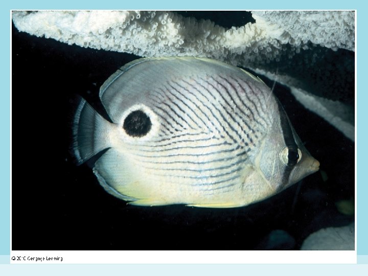Fish Coloration and Patterning • Countershading is seen in open ocean fish – obliterative countershading—coloration in which the back (dorsum) is dark colored, and graduates on the sides to the belly’s pure white – when viewed from above, dark color blends in with surrounding water; when viewed from below, white belly blends in with lit surface waters • Disruptive coloration—background color of the body is usually interrupted by vertical lines; may be a dark dot (“eyespot”) present in tail area – more difficult for predators to see the fish