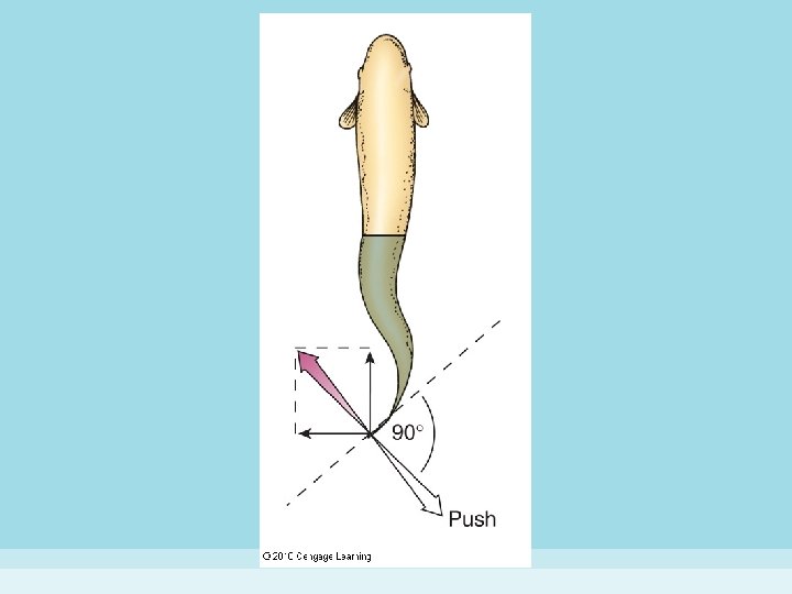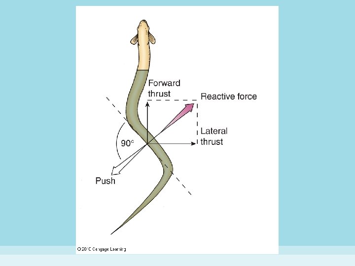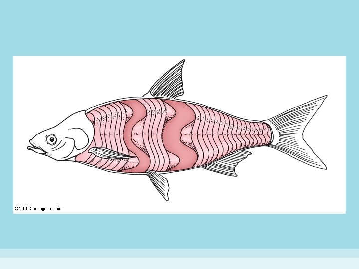 Locomotion • In swimming, the trunk muscles propel the fish through the water – trunk muscles are arranged in a series of muscle bands – muscles contract alternately from one side of the body to the other – contractions originate at the anterior end and move toward the tail, flexing the body and pushing against the water