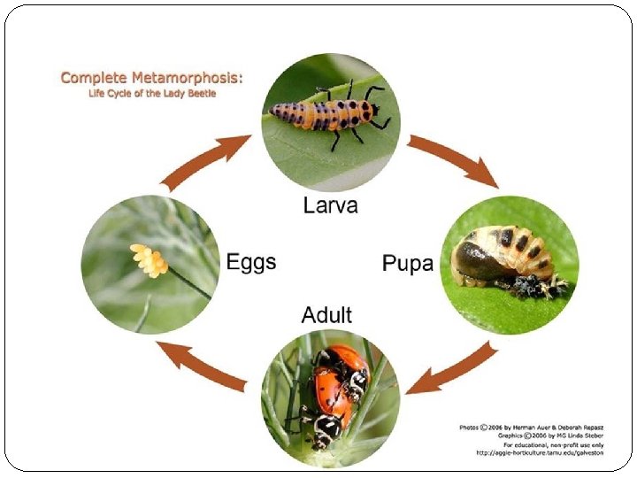 Life cycle Begin as tiny, hard-shelled fertilized eggs Go through metamorphosis (2 types) Complete Metamorphosis- 4 stages (butterflies, ants) Eggs hatch into larvae Larvae usually look like worms and specialized for eating and growing Larvae becomes Pupa- enclosed in protective covering Major changes in structure occurring in this phase Pupa becomes an Adult