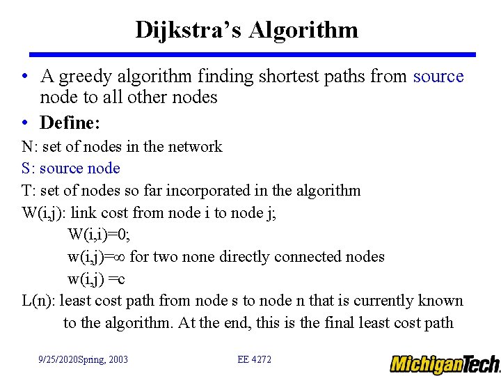 Dijkstra’s Algorithm • A greedy algorithm finding shortest paths from source node to all other nodes • Define: N: set of nodes in the network S: source node T: set of nodes so far incorporated in the algorithm W(i, j): link cost from node i to node j; W(i, i)=0; w(i, j)= for two none directly connected nodes w(i, j) =c L(n): least cost path from node s to node n that is currently known to the algorithm. At the end, this is the final least cost path 9/25/2020 Spring, 2003 EE 4272