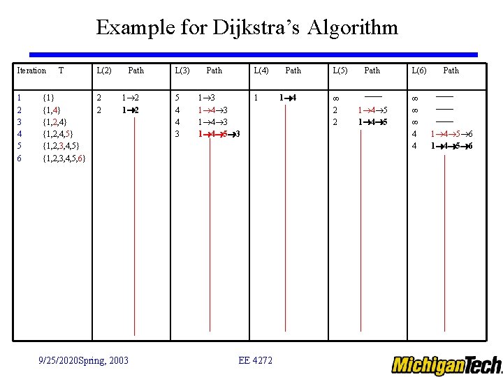 Dijkstra’s Algorithm (Con’t) Step 1: Initialization T = {s} : at initial stage, only source node included L(n) = w(i, j) for all n s Step 2: Find the neighboring node x not in T that has the least-cost path from source node s and include that node into T, i. e. , add node x to set T Step 3: Update least-cost paths due to node x included L(n) = min [L(n), L(x) +w(x, n)] Step 4: algorithm terminates when all nodes included in T, otherwise, go back to step 2 9/25/2020 Spring, 2003 EE 4272