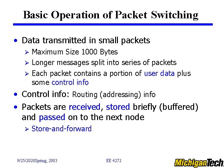 Basic Operation of Packet Switching • Data transmitted in small packets Maximum Size 1000 Bytes Ø Longer messages split into series of packets Ø Each packet contains a portion of user data plus some control info Ø • Control info: Routing (addressing) info • Packets are received, stored briefly (buffered) and passed on to the next node Ø Store-and-forward 9/25/2020 Spring, 2003 EE 4272