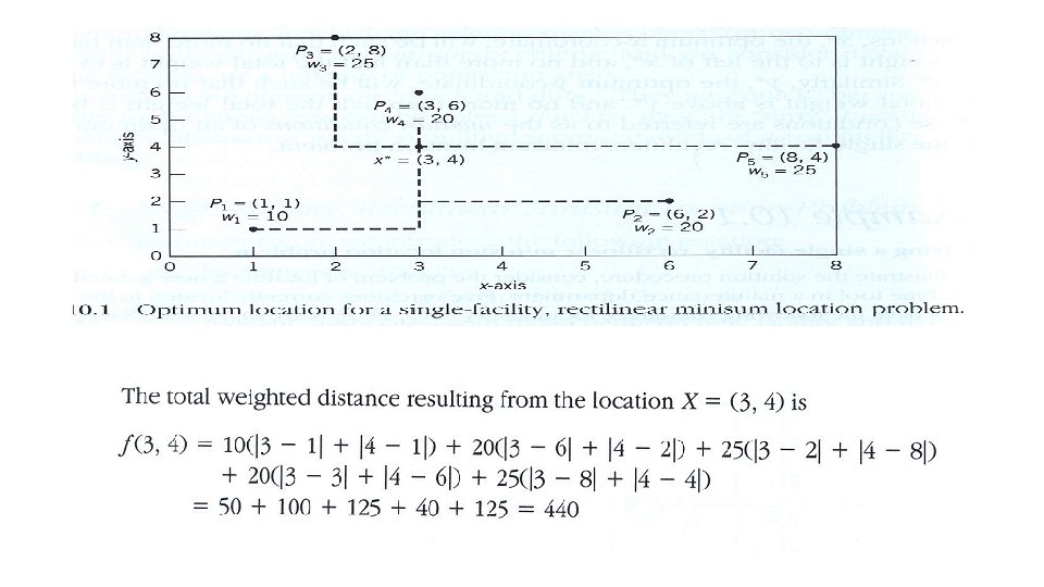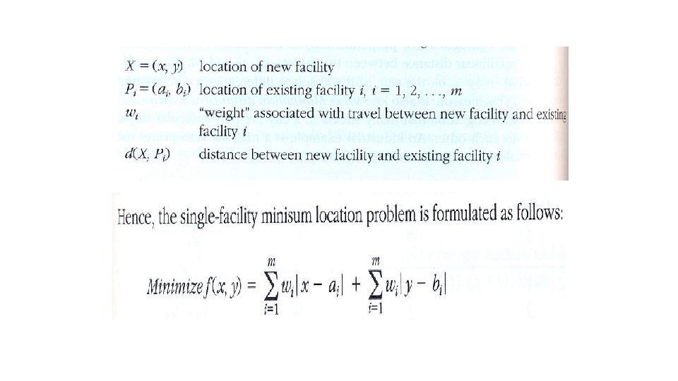 Single Facility Rectilinear Minisum ØThe annual cost of travel B/W the new facility and existing facility is assumed to be proportional to the distance B/W the points X and Pi, with wi denoting the constant of proportionality. ØThe objective is to;