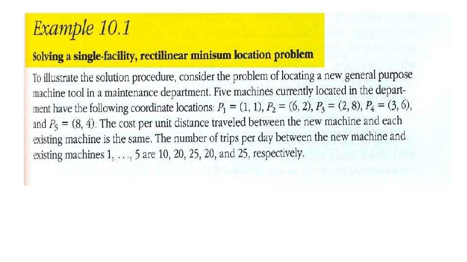 Applications of Rectilinear Distance ØRectilinear Distance facility location problem because it represents a situation commonly encountered in manufacturing and distribution settings. ØIt occurs in many cities, due to the layout streets. Ø An industrial example is a material transporter moving along Rectilinear aisles in a factory