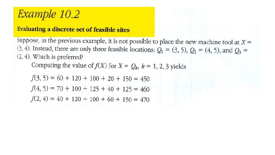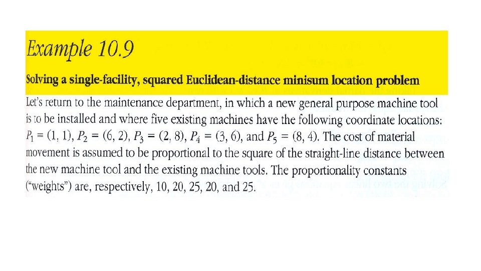 Single Facility Squared Euclidean Minisum Ø Squared Euclidean Minisum often referred to as the “gravity problem”. ØIn this the “COST OF TRAVEL” between a single new facility and multiple existing facilities to be proportional to the square of the Euclidean distance between the facilities ØThe optimum solution for the gravity problem is “centroid location”