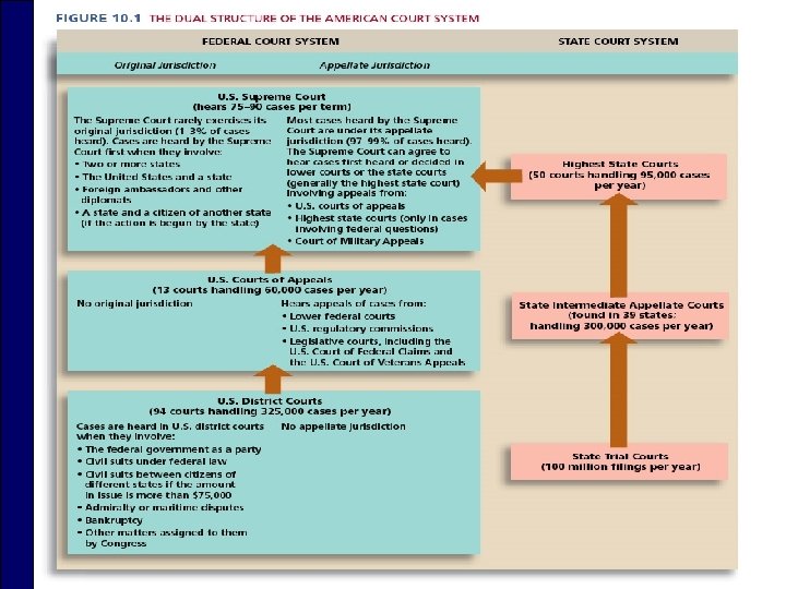 The American Legal System o o Trial courts n Courts of original jurisdiction where a case begins Appellate courts n Courts that generally review only findings of law made by lower courts o Jurisdiction n Authority vested in a particular court to hear and decide the n issues in any particular case Original jurisdiction: The jurisdiction of courts that hears a case first, usually in a trial o Courts determine the facts of a case under their original jurisdiction. n Appellate jurisdiction: The power vested in an appellate court to review and/or revise the decision of a lower court