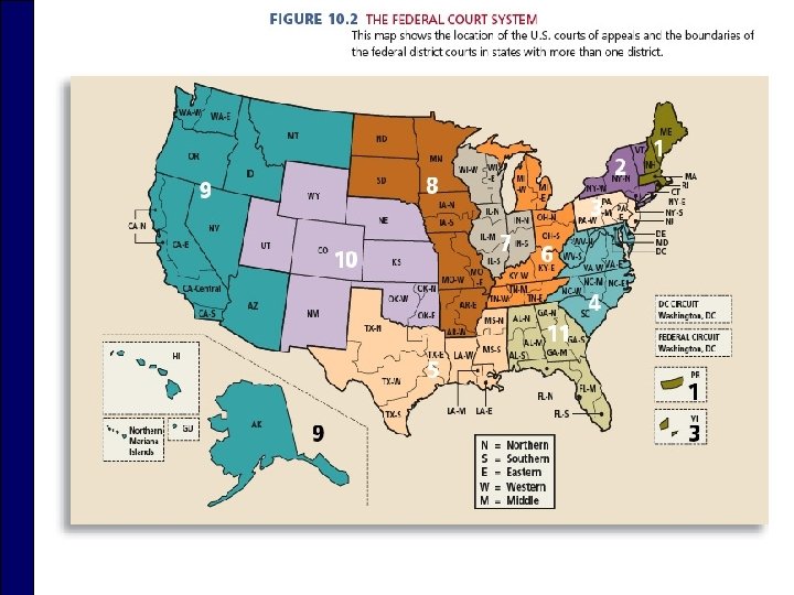 The Federal Court System o District Courts n 94 federal district courts staffed by 646 active judges, assisted by more than 300 retired judges n No district courts cross state lines n Every state has at least one federal district court n The most populous states have four. (CA, TX, and NY)