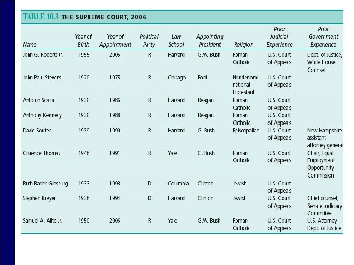 Appointments to the U. S. Supreme Court o Nomination Criteria n Competence n Ideology or Policy Preference o Strict constructionist: an approach to constitutional interpretation that emphasizes the Framer’s original intentions n n Rewards Pursuit of Political Support Religion Race, Ethnicity, and Gender