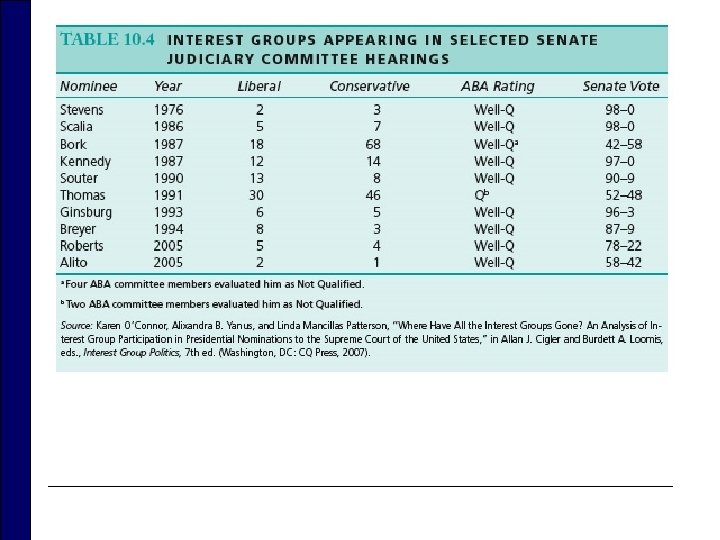 The Supreme Court Confirmation Process o o Investigation Lobbying by Interest Groups Senate Committee Hearings Senate Vote n Few recent confirmations have been close; closest in recent history o Clarence Thomas 52 -48 (1991) o Samuel A. Alito 58 -42 (2005)