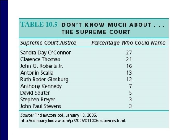 The Supreme Court Today o Surprising that so many Americans know next to nothing about the judicial system o Half surveyed in 2006 could not name a single member of the court n Lack of interest n Court’s privacy and sense of decorum n Does not televise its proceedings