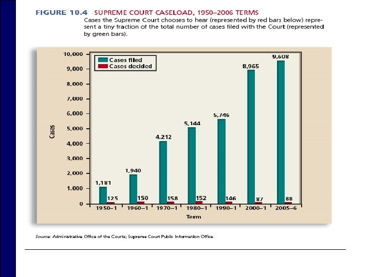 The Supreme Court Today: Deciding to Hear a Case o Nearly 8, 000 cases were filed at the Supreme Court in its 2005 -2006 term. n 87 heard, 74 decisions issued n Early years relatively few cases decided o Main duty: riding the circuit n 1940 s fewer than 1000 cases filed annually n Increased over time n Modern period, many of the cases have involved Bill of Rights issues