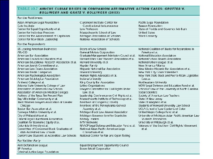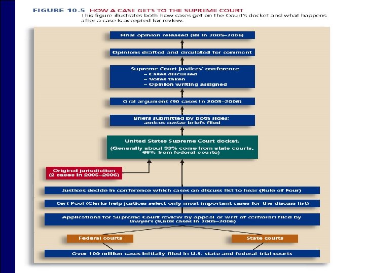 How Does a Case Survive the Process? o Characteristics of the cases the Court accepts: n The federal government is the party asking for review. o Solicitor General n The case involves conflict among circuit courts. n The case presents a civil rights or civil liberties question. n The case involves ideological and/or policy preferences of the justices. n The case has significant social or political interest, as evidenced by the presence of interest group amicus curiae briefs.
