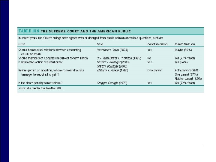 Judicial Policy Making and Implementation o Policy making: n More than one hundred federal laws have been declared unconstitutional. n Ability to overrule itself o Judicial Implementation: n Refers to how and whether judicial decisions are translated into actual public policies affecting more than the immediate parties to a lawsuit