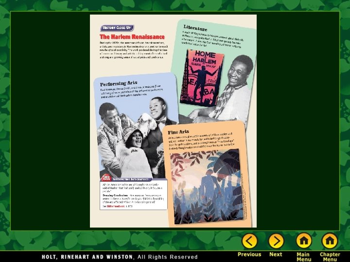 The Harlem Renaissance The Main Idea Transformations in the African American community contributed to a blossoming of black culture centered in Harlem, New York. Reading Focus • What was the Great Migration, and what problems and opportunities faced African Americans in the post–World War I era? • What was Harlem, and how was it affected by the Great Migration? • Who were the key figures of the Harlem Renaissance?