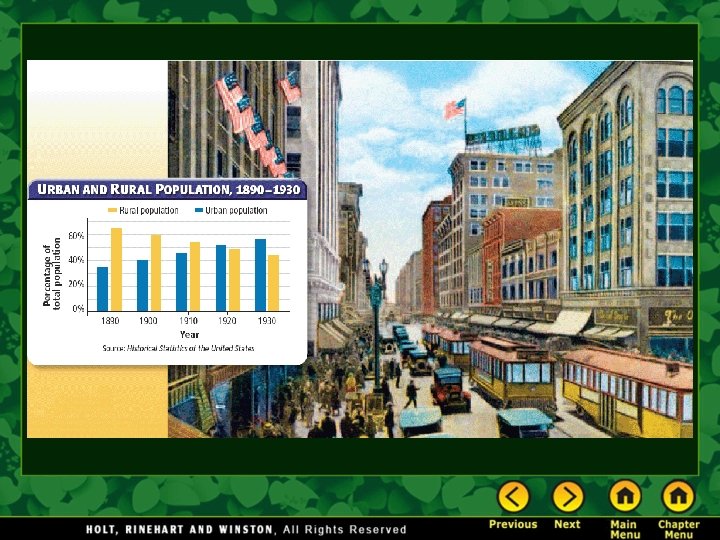 Effects of Urbanization • Though the 1920 s was a time of great economic opportunities for many, farmers did not share in the prosperity. • Farming took a hard hit after World War I, when demand for products went down and many workers moved to industrialized cities. • The 1920 census showed that for the first time ever, more Americans lived in cities than in rural areas, and three-fourths of all workers worked somewhere other than a farm. • The rise of the automobile helped bring the cities and the country together, and rural people were now likely to spend time in town and were less isolated. • Education also increased, and by the 1920 s many states passed laws requiring children to attend school, helping force children out of workplaces. School attendance and enrollment increased as industry grew because more people could afford to send their children to school, not to work.