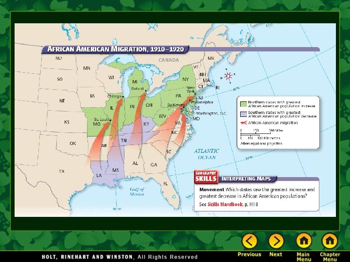 The Great Migration • Beginning around 1910, Harlem, New York, became a favorite destination for black Americans migrating from the South. • Southern life was difficult for African Americans, many of whom worked as sharecroppers or in other low-paying jobs and often faced racial violence. • Many African Americans looked to the North to find freedom and economic opportunities, and during World War I the demand for equipment and supplies offered African Americans factory jobs in the North. • African American newspapers spread the word of opportunities in northern cities, and African Americans streamed into cities such as Chicago and Detroit. • This major relocation of African Americans is known as the Great Migration.