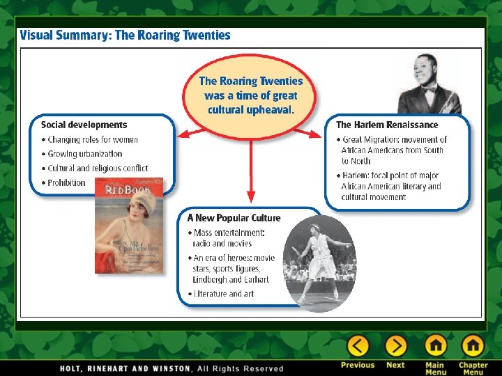 Chapter 10 – The Roaring Twenties Section Notes Video American Life Changes The Harlem Renaissance A New Popular Culture is Born The Roaring Twenties History Close-up Maps African American Migration, 1910 – 1920 The Harlem Renaissance Images Quick Facts Visual Summary: The Roaring Twenties The Charleston Urban and Rural Population, 1890 – 1930 The Spirit of St. Louis Flappers