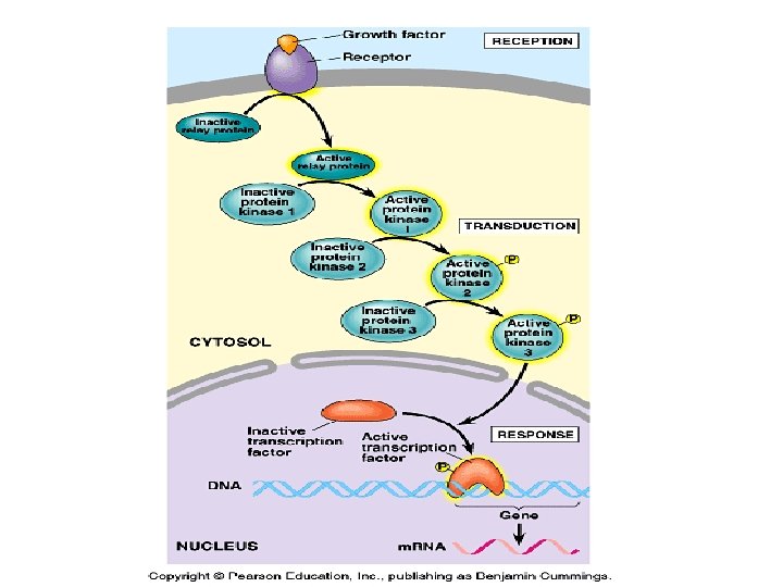 Fig. 11 -7 c Ligand-binding site Signaling molecule (ligand) Signaling molecule Helix Tyrosines Tyr Tyr Tyr Tyr Tyr Receptor tyrosine kinase proteins CYTOPLAS M Dimer 1 2 Activated relay proteins Tyr Tyr P P Tyr Tyr 6 ATP Activated tyrosine kinase regions 6 ADP Tyr P P P Tyr Tyr P P Fully activated receptor tyrosine kinase Inactive relay proteins 3 4 Cellular response 1 Cellular response 2