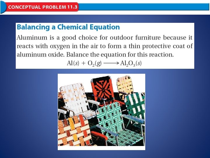 11. 1 Balancing Chemical Equations • A chemical reaction is also described by a balanced equation in which each side of the equation has the same number of atoms of each element and mass is conserved.