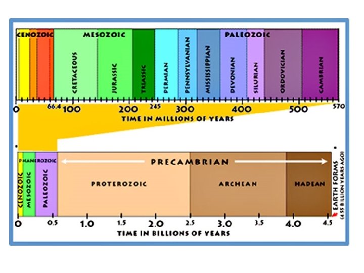 Geologic time measurements • Eon = billions of years • Era = millions of years • Period = tens of millions of years or hundred of millions of years
