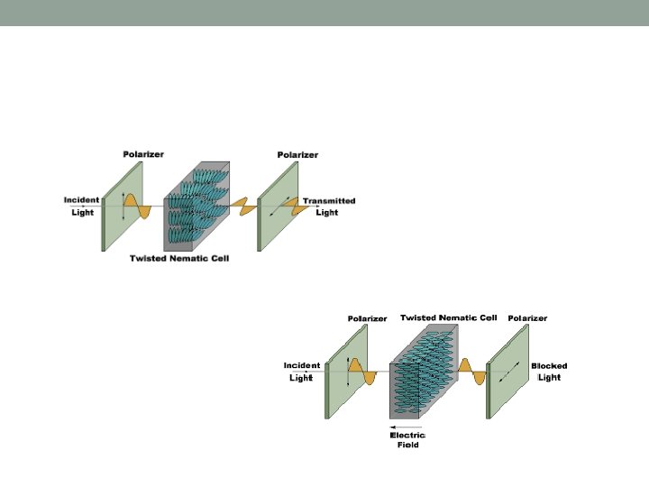LCD Displays • Liquid Crystal displays (SCDs) are used in watches, calculators, and computer screens • A thin liquid crystalline material is placed between 2 electrically conducting glass electronde • When electricity passes through the electrodes the polarization of the light can “twist” which will allow light to flow through it.