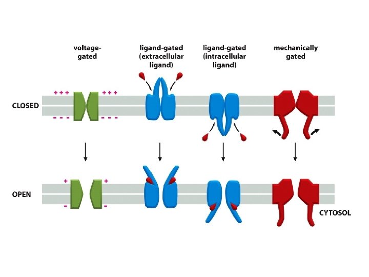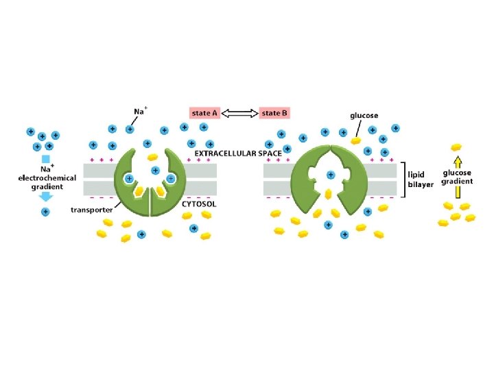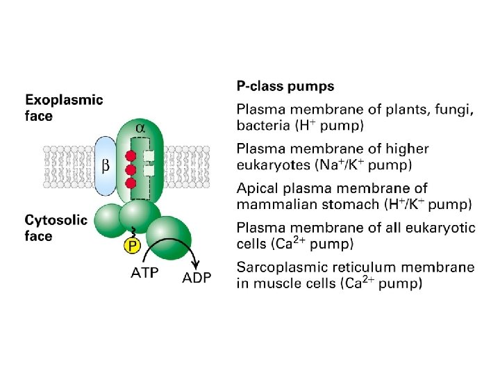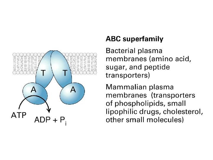 I. Principles of membrane transport - protein-free lipid bilayers are highly impermeable to ions - two main classes of membrane transport proteins - transporters ( also called carriers or permeases) and channels - active transport – mediated by transporters coupled to an energy source - passive transport – mediated by all channels and many transporters II. Transporters and passive transport - glucose transporters III. Transporters and active transport - coupled transporters; ATP-driven pumps; light-driven pumps - uniporters; symporters; antiporters - Na+-glucose cotransporter – coupled transport; symporter - lactose permease - coupled transport; symporter - three classes of ATP-driven pumps - Ca 2+ pump - Na+-K+ pump - ABC transporters IV. Ion channels - ion channels are selective and gated - membrane potential - K+- channel - aquaporins - neuron - voltage-gated Na+-channels - transmitter-gated ion channels - neuromuscular transmission