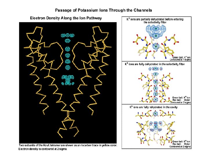From the x-ray structure of the Kcs. A potassium channel at 2. 0 -Å resolution it was determined that the selectivity filter is a narrow, 12 -Å-long segment of the pore that is lined with carbonyl oxygen atoms. These atoms act as surrogate water molecules, allowing potassium ions to shed their hydration shell and enter into the pore. Two potassium ions bind in the selectivity filter at once, usually with an intervening water molecule. Entry of a potassium ion from one side of the filter is associated with potassium ion exit from the opposite side, resulting in rapid, efficient potassium ion conduction. Electrostatic repulsion between ions apparently prevents the potassium ions from binding too tightly, allowing high throughput in the setting of high selectivity.
