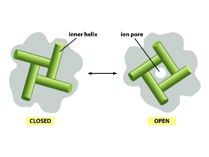 Gating Large conformational changes within the membrane underlie pore opening in K+ channels. Inner helices obstruct the pore in the closed state and expand its intracellular diameter in the opened state. Different gating domains – ligand binding and voltage sensingappear to bring about a similar conformational change in the pore of K+ channels