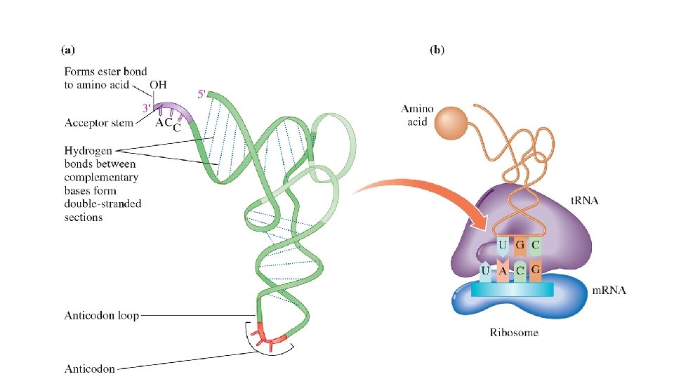t. RNA, the smallest RNA, is the only type of RNA that can translate genetic information into amino acids for proteins. t. RNA has a cloverleaf shape when hydrogen bonds form between its complementary bases. The acceptor stem attaches to an amino acid and its anticodon bonds with a codon on m. RNA. 21 Insert Figure 17. 10 pg 612.