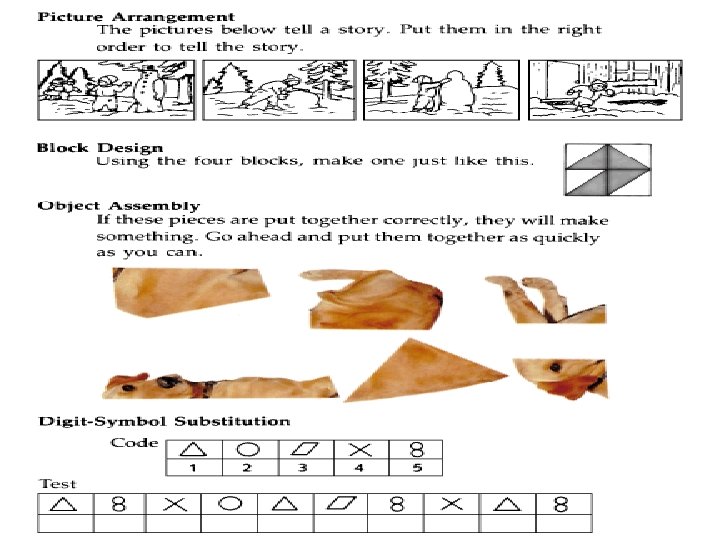 Assessing Intelligence- Sample Items from the WAIS VERBAL PERFORMANCE General Information Similarities Arithmetic Reasoning Vocabulary Comprehension Digit Span Picture Completion Picture Arrangement Block Design Object Assembly Digit-Symbol Substitution