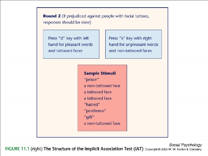 Implicit Attitudes l Are automatically activated evaluations outside of a person’s awareness (unconscious) – – l Formed slowly through experience Very resistant to extinction Changing implicit attitudes – Can be changed without subject’s conscious awareness l Prime subjects with counterstereotypes