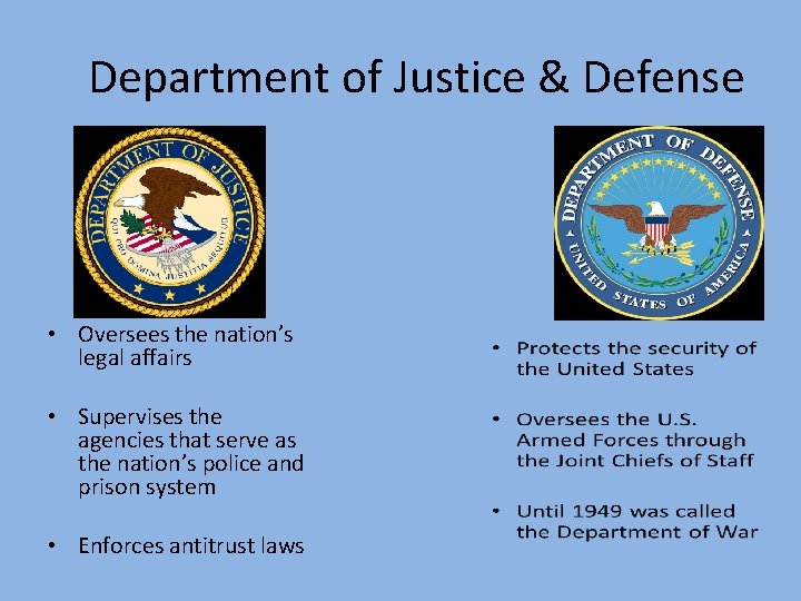 Department of Justice & Defense • Oversees the nation’s legal affairs • Supervises the agencies that serve as the nation’s police and prison system • Enforces antitrust laws