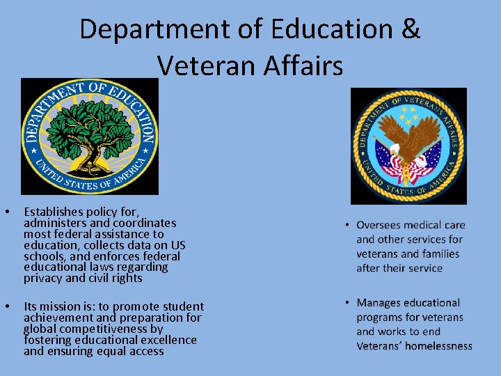 Department of Education & Veteran Affairs • Establishes policy for, administers and coordinates most federal assistance to education, collects data on US schools, and enforces federal educational laws regarding privacy and civil rights • Its mission is: to promote student achievement and preparation for global competitiveness by fostering educational excellence and ensuring equal access