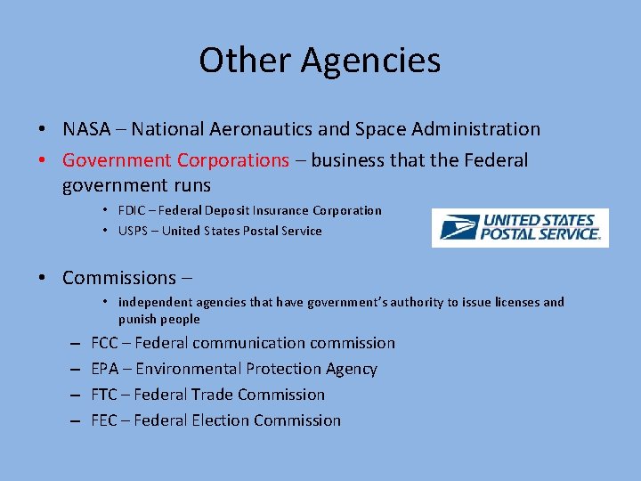 Other Agencies • NASA – National Aeronautics and Space Administration • Government Corporations – business that the Federal government runs • FDIC – Federal Deposit Insurance Corporation • USPS – United States Postal Service • Commissions – • independent agencies that have government’s authority to issue licenses and punish people – – FCC – Federal communication commission EPA – Environmental Protection Agency FTC – Federal Trade Commission FEC – Federal Election Commission