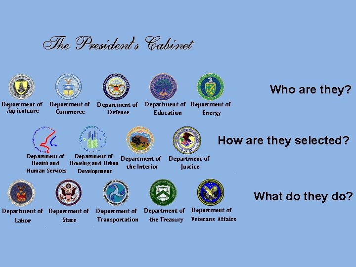 Presidential Cabinet Today • Secretary of State • Secretary of the Treasury • Attorney General (Justice Dept. ) • Secretary of Defense • Secretary of the Interior • Secretary of Agriculture • Secretary of Commerce • Secretary of Labor • Secretary of Health and Human Services • Secretary of Housing and Urban Development • Secretary of Transportation • Secretary of Energy • Secretary of Education • Secretary of Veterans Affairs • Secretary of Homeland Security