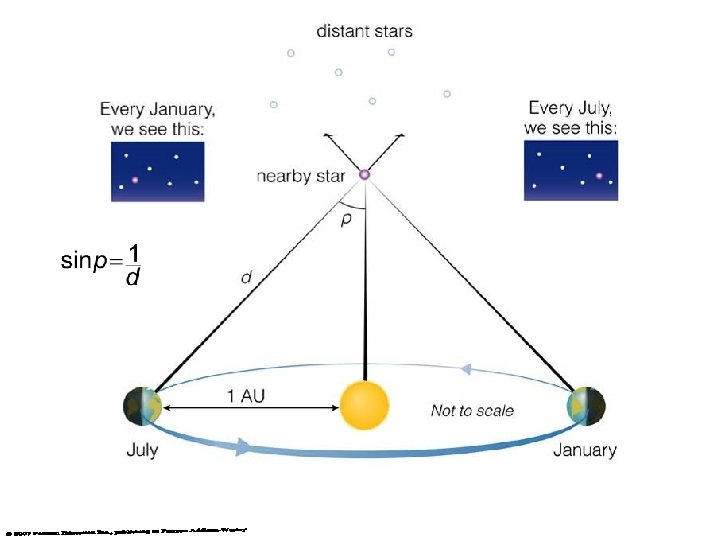 • Apparent positions of the nearest stars shift by only about an arcsecond as Earth orbits the Sun, and the shift is smaller for more distant stars. • These very small angles explain why the Greeks were unable to detect parallax with their naked eyes. Parallax of a Nearby Star
