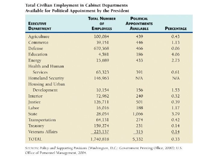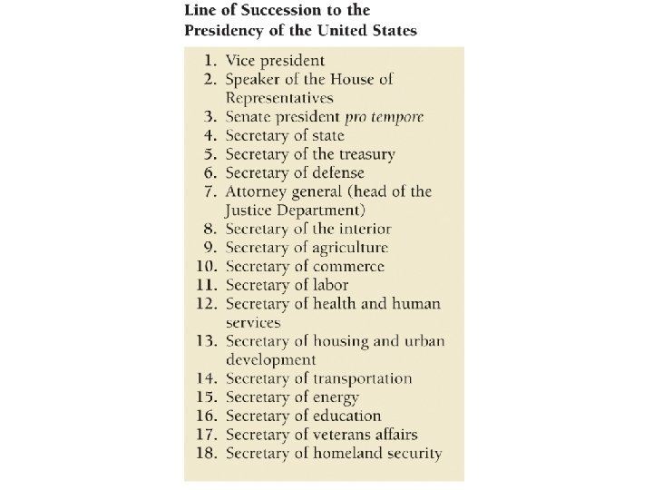 The Executive Organization • By far the largest growth within the executive branch has occurred in the twentieth century. Prior to the administration of Franklin Roosevelt, the size of the executive branch was less than half its current size. But Roosevelt’s administration, overburdened in its attempts to administer its New Deal programs, increased the size of federal bureaucracy to accommodate its new responsibilities. Chapter 12 of the textbook will focus on the federal bureaucracy; the following represents the organization of those who formally advise the president. – The cabinet - the 13 department secretaries and the attorney general who meet to receive directives from the president, provide the president with information from their area of specialization, and to advise the president on matters of state.