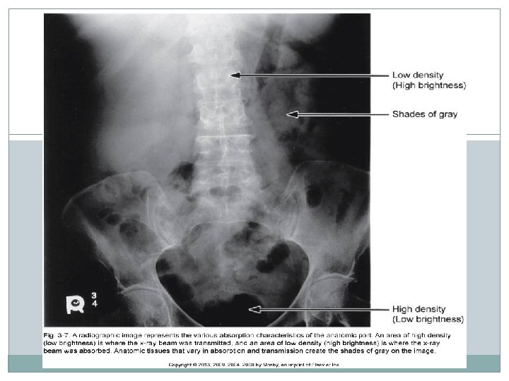 Scale of Grays �Anatomic tissues that vary in absorption and transmission will create a range of dark and light areas. �The scale of image densities are created by x-ray absorption and transmission of the x-ray beam as it passes through anatomic tissues.