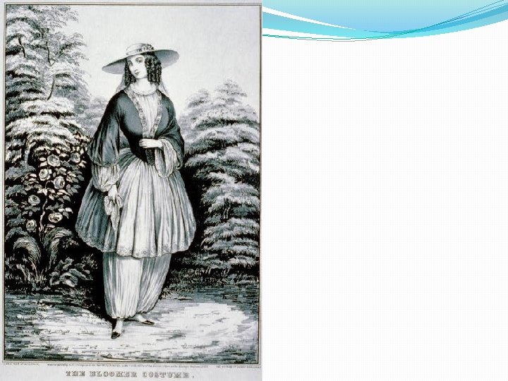 Women and Work �Early feminists challenged the idea of a “women’s sphere” in a number of ways. �Some wore a new style of dress made of loosefitting tunics and trousers, called “bloomers, ” intended to liberate women from the extremely restrictive dresses and corsets that so confined them as to make it impossible for them to engage in much physical activity. Traditional clothing was cumbersome and heavy (whale bone corsets). Amelia Bloomer Background: https: //www. nps. gov/wori/learn/historyculture/amelia-bloomer. htm Bloomers Image: http: //www. loc. gov/exhibits/treasures/images/vc 006204. jpg
