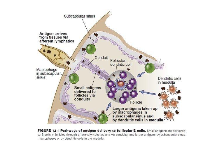 Pathways of antigen delivery to follicular B cells • Most antigens from tissue sites are transported to lymph nodes by afferent lymphatic vessels that drain into the subcapsular sinus of the nodes. Soluble antigens, generally smaller than 70 k. D, may reach the B cell zone through conduits that extend between the subcapsular sinus and the follicle and interact directly with specific B cells • Subcapsular sinus macrophages capture large microbes and antigen-antibody complexes and deliver these to follicles, which lie under the sinus • Many relatively large antigens that enter the node through afferent lymphatic vessels are not captured by subcapsular sinus macrophages but are too large to enter the conduits