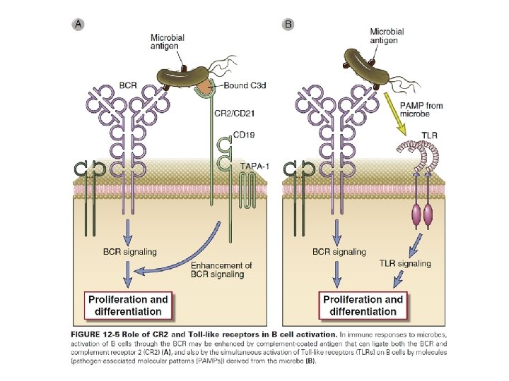 Step 2. Activation of B Cells by Antigens and Other Signals • The activation of antigen-specific B lymphocytes is initiated by the binding of antigen to membrane Ig molecules, which, in conjunction with the associated Igα and Igβ proteins, make up the antigen receptor complex of mature B cells • B cell activation is facilitated by the CR 2/CD 21 coreceptor on B cells, which recognizes complement fragments covalently attached to the antigen or that are part of immune complexes containing the antigen • Microbial products engage Toll-like receptors (TLR 5, 7) on B cells, which also enhances B cell activation