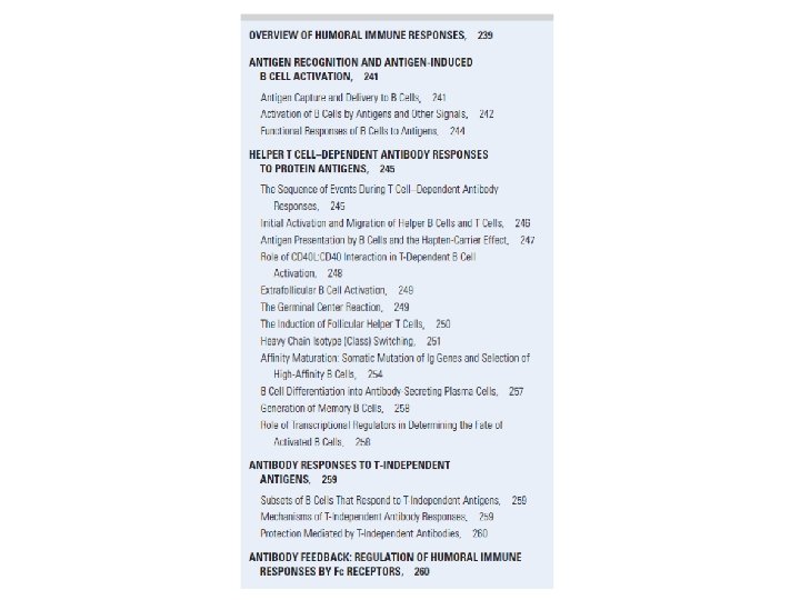 General Feature of Humoral Immune Responses • The type and amount of antibodies produced vary according to the: type of antigen driving the immune response, the involvement of T cells, a prior history of antigen exposure, and the anatomic site at which activation occurs • Antibody responses to protein antigens require that the antigen be specifically recognized and internalized by B cells and that a peptide fragment of the internalized protein be presented to CD 4+ helper T lymphocytes that then activate these B cells • Antibody responses to multivalent non-protein antigens with repeating determinants, such as polysaccharides, some lipids, and nucleic acids, do not require antigen specific helper T lymphocytes (thymus independent or Tindependent antigens)
