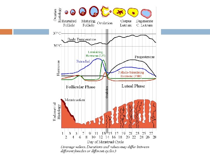 Estrous Cycle Proestrous- period immediately before estrous development of the endometrium and ovarian follicles Estrous-Estrus refers to the phase when the female is sexually receptive, Ovarian follicles maturing Metestrous- Corpus luteum starts to form, small amounts of progesterone Dietrous –CL produces progesterone. Preg? - keep the lining and begin gestation Not Preg? - uterine lining is shed, CL regresses