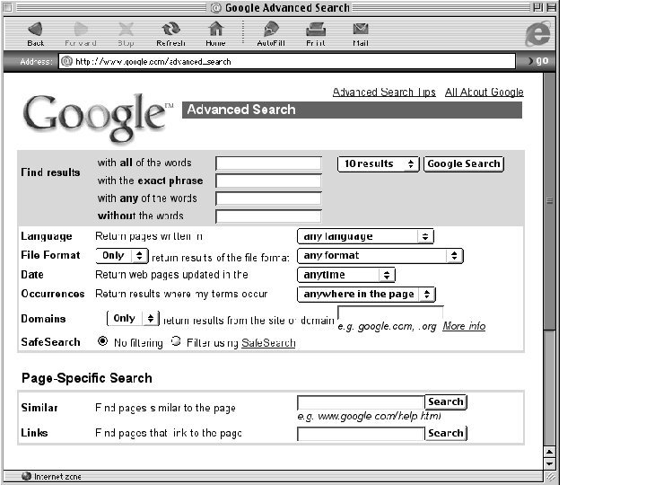 • Putting a whole Web search in a page is very easy. • Do a search on the search engine you want to embed in your page. • Observe the query string. http: //www. google. com/search? q=wildebeest&btn. G=Go ogle+Search • Construct a form in your page which, when submitted, produces an identical query string. • It is customary to give the search engine advance credit by putting their icon next to your search utility.