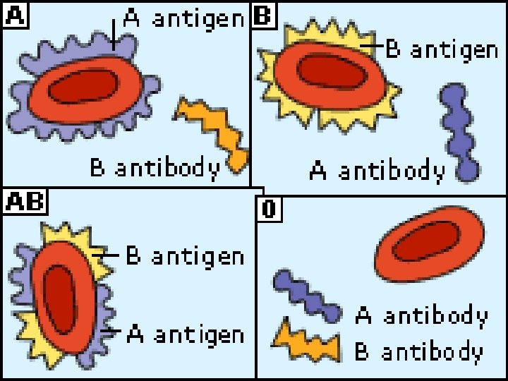 Transfusions Blood Group Antigens Antibodies Can give blood to Can receive blood from AB AB, A, B, and O Universal Acceptor AB A and B None A A B A and AB A and O B B A B and AB B and O Universal Donor O None A and B AB, A, B and O O