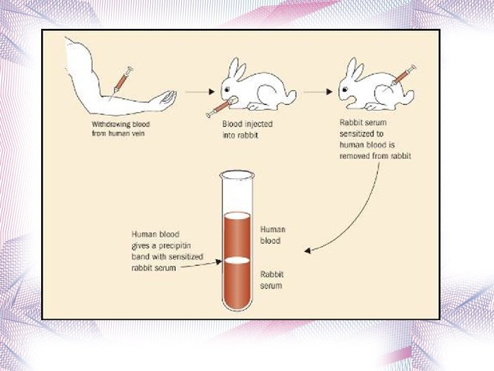 Is it human blood? Precipitin Test: • Human blood is inserted into animal (rabbit) • Rabbits produce antibodies to react against the human blood • Blood is drawn from rabbit that contains the human antibodies produces human antiserum • Unknown blood sample, if human, will react with the human antiserum from the rabbit by forming a precipitate