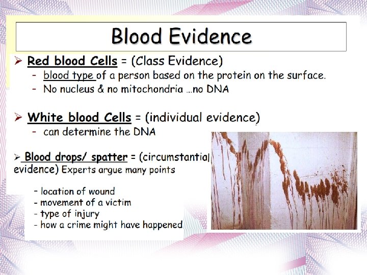 Blood Spatter A group of bloodstains created when a wound is inflicted Blood spatterns can give information about – Origin of the blood – Direction of blood – Cause of injury