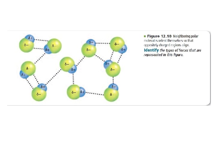 Dipole-dipole forces • Attraction between oppositely charged regions of polar molecules – Polar molecule = • Neighboring polar molecules orient themselves so that oppositely charged regions align