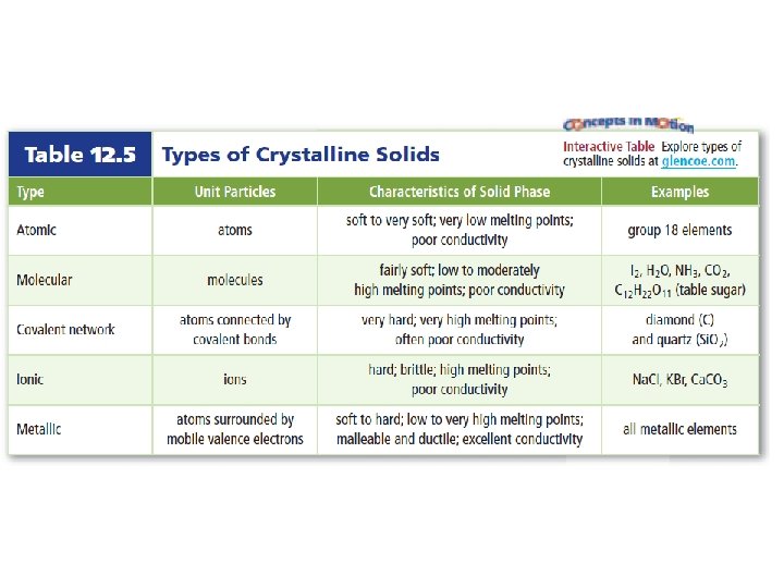 • Categories of crystalline solids – Classified based on the types of particles they contain and how they are bonded together