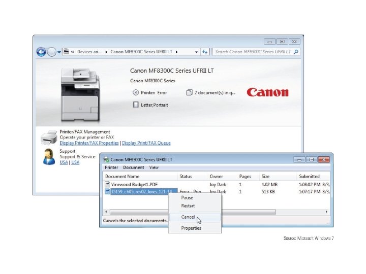Managing the Printer Queue • Spooling: process of queuing print requests from application • Print spooler: print queue • To manage print queue: double-click the printer icon in Windows 7 Devices and Printers window • If the printer reports a problem with printing, will be displayed as the status for the first job in the queue • To cancel a print job, right-click the job and select Cancel from shortcut menu • To cancel all print job, click Printer and select Cancel All Documents